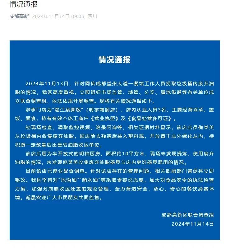 11月14日,成都高新发布情况通报:2024年11月13日,针对网传成都益州大道一餐馆工作人员捞取垃圾桶内废弃油脂的情况,我区高度重视,立即组
